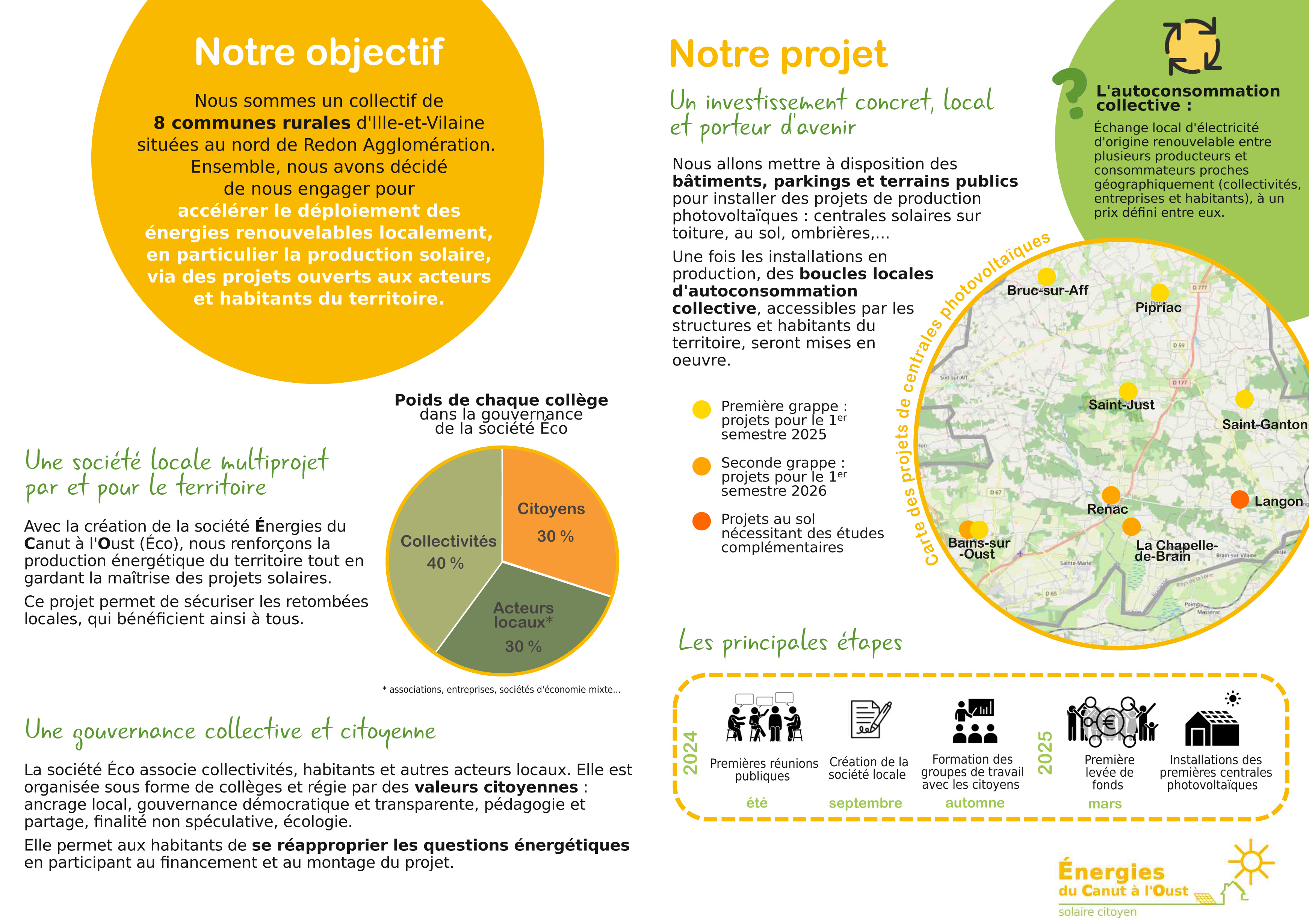 Cette société regroupe plusieurs communes d’Ille et Vilaine, EPV, le SDE et sera ouverte à un collectif citoyen voulant s’impliquer dans l’émergence collective de projets d’énergie renouvelable sur le territoire des communes concernées : La Chapelle-de-Brain, Renac, Saint-Just, Langon, Saint-Ganton, Bains-sur-Oust, Pipriac et Bruc-sur-Aff.