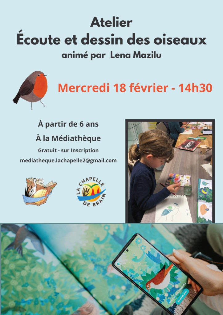 Léna Mazilu sera présente à la médiathèque Mercredi 18 février à 14h30 pour animer une séance de dessin d’observation et d’écoute de chants d’oiseaux à partir de l’application Birdie Memory. Cette atelier permet la pratique du dessin animalier et une initiation à l’ornithologie.