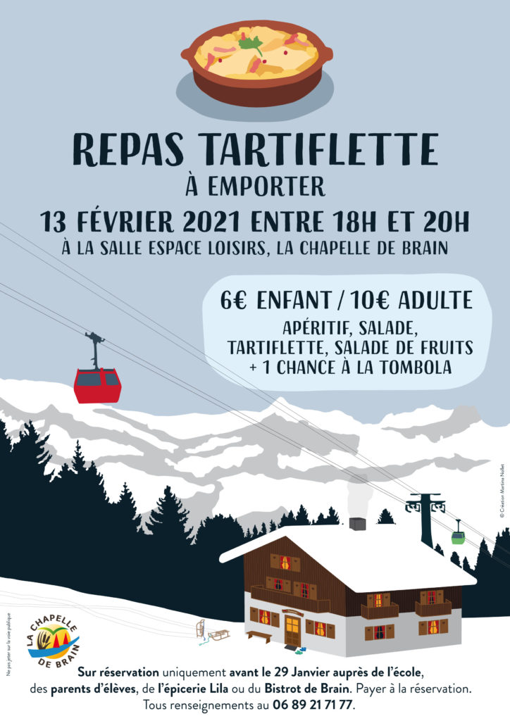 En raison des contraintes liées au contexte sanitaires, le repas Tartiflette de l’école de la Chapelle-de-Brain se fera à emporter uniquement cette année.
